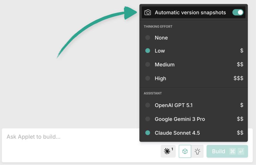 Tip: If you'd always like new versions to be added to the board as a snapshot, you can enable Automatic version snapshots in the prompt bar menu: