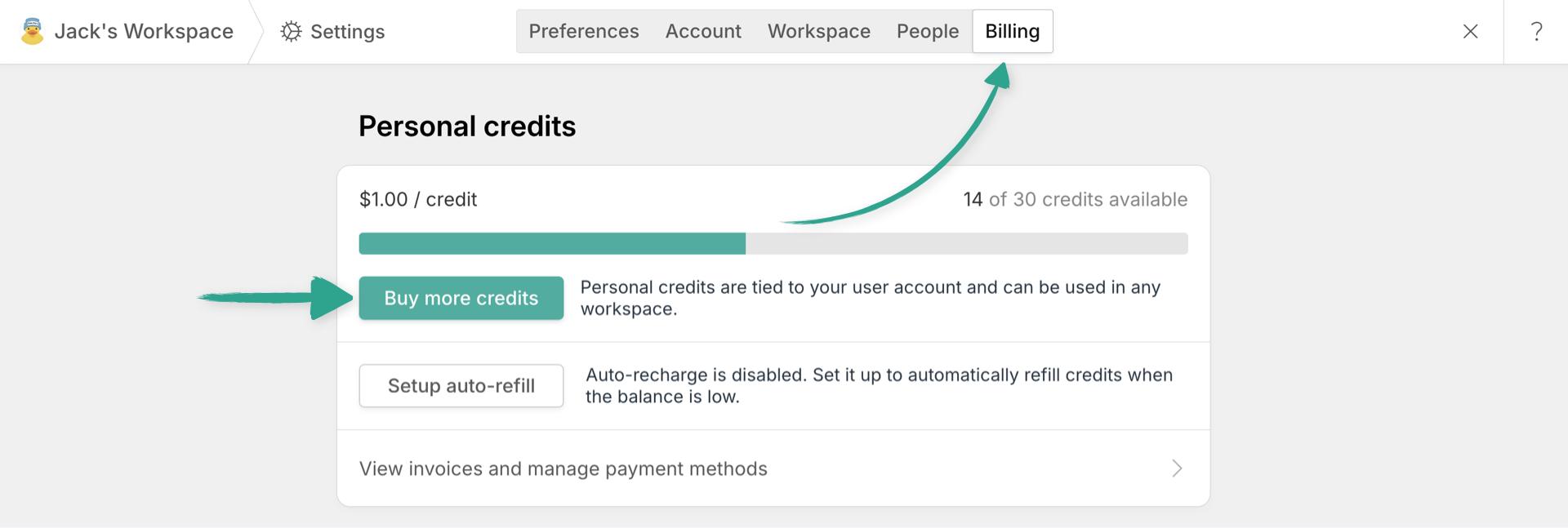 If you ever run out of credits you can add more under your billing settings, which you can find in the command menu (Command or Ctrl + K) or by clicking on your workspace name in the top left corner: