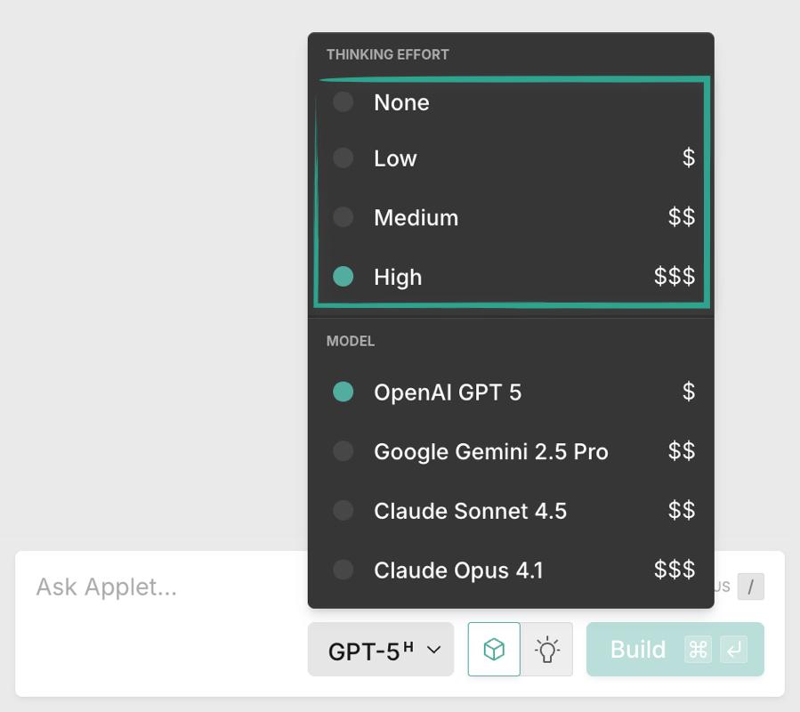 Important: Applets you build are front-end only, so any API keys you provide to the applet can be accessed publicly. Keep this in mind if integrating with external services.